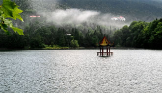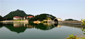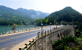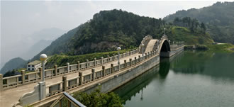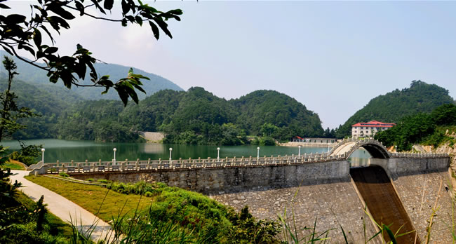 莲花台水库的开发任务是为庐山旅游区供水并改善庐林湖生态及风景质量的水源工程,其供水范围面积为30平方公里,正常蓄水位为912米,相应库容86.85万立方米,校核洪水位为912.79米,设计洪水位为912.68米,死水位为887米。莲花台水库多年平均供水量188万吨。大坝为细石砼砌块石重力坝,最大坝高46米,采用坝顶开敞式溢洪道,坝内埋设一管作引水兼放空两用,放空管采用锥形阀控制,引水为通过坝后式泵房加压提水至庐林湖,供水为省内少有的长距离高水头的供水型式。考虑庐山旅游区的特点,坝顶交通采用拱桥结构,小桥流水,山水相映,为庐山增加了一处怡人的风景点。