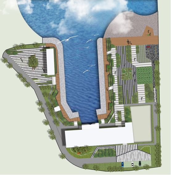 该区域位于待新建候班楼周边,为工作人员的休息居住场所,也是整个厂区的入口区域。景观设计元素由前广场、林荫道、石笼挡墙、卵石散铺、景观廊、花坛、石笼坐凳和四季观赏植物组成;利用台阶及错落形式的石笼景墙来处理场地高差,运用生态景观理念打造一个人性化的舒适户外空间。