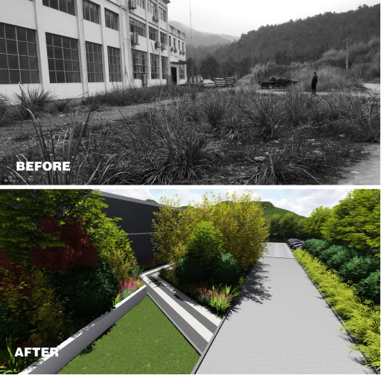 该区域位于主厂房后方,设计团队运用简约平面构图手法,以植物营造与指示性铺装相结合构建区域场地交通流线,结合休闲功能的单臂花架、石笼坐凳、景墙,为工作人员提供休闲场所;设计充分考虑避免场地与电缆支架的冲突,种植上采用一定观赏性的小型乔木和绚丽夺目的花灌木进行组合,力图创建一个生态丰富性的游憩空间。