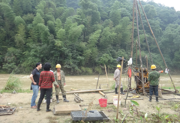 四方井水利枢纽工程是宜春市重大民生工程,是江西省重大水利工程和国家重点水利工程。水库设计总库容1.2亿立方米,是一座具有防洪、供水、灌溉等综合效益的大(二)型水利枢纽工程。4月下旬,四方井水利枢纽工程项目建议书审查会召开后,我院积极贯彻落实孙晓山厅长的指示精神,不畏艰难,上下联动,稳步推进四方井工程项目建议书的修改完善工作。根据专家意见,项目补充勘察需要钻探两个大约70米的深孔。面对时间紧、任务重、雨季山洪陡涨陡落等实际困难,地勘分院组织了精干的野外作业机组负责此次补勘任务,项目组共有包括地质项目负责人吴平、后勤管理人员黄东胜,机长齐宝江、组员徐龙扣等在内的8名工作人员。